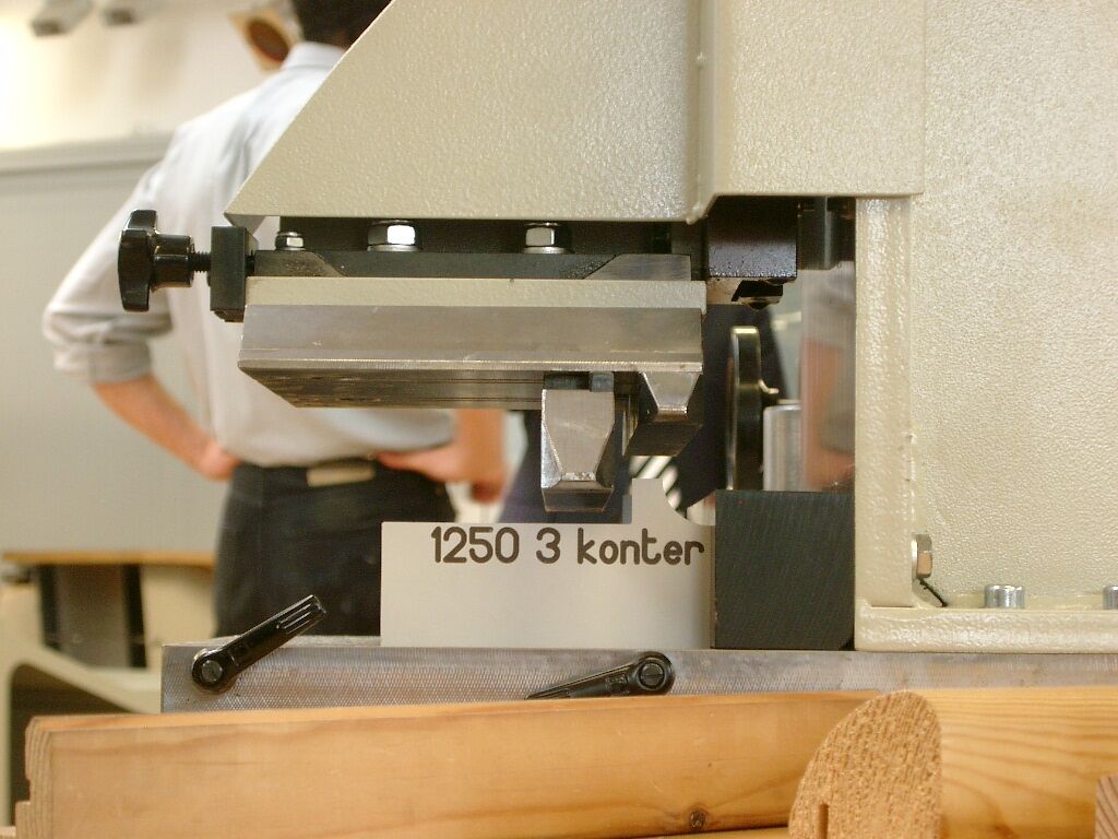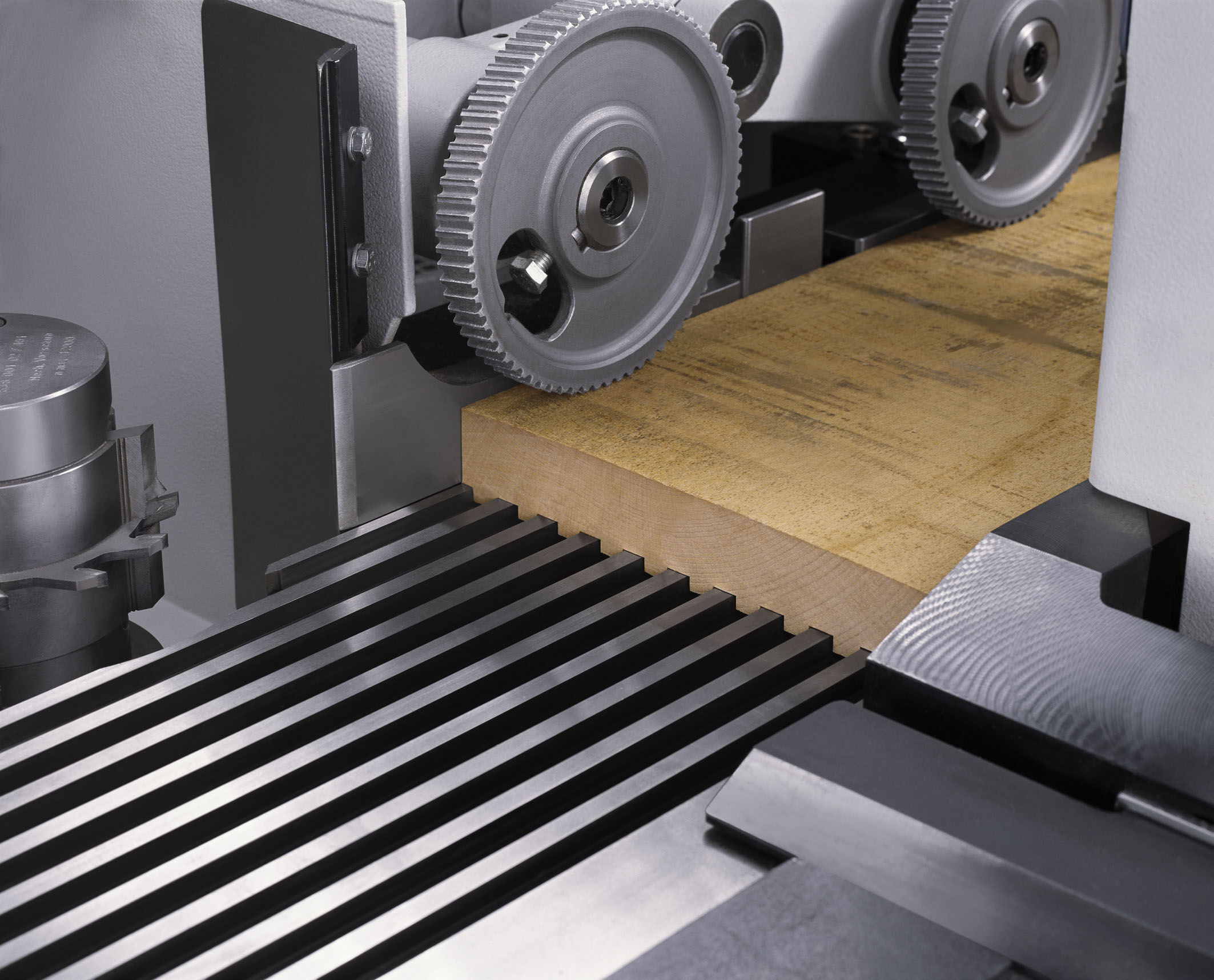 Radni stol s utorima u stroju osigurava da obradak kroz stroj putuje ravno i potpuno paralelno. Glodalica na prvoj donjoj glavi izrađuje utore na obratku, kao što je prikazano na donjoj slici. Ti utori služe kao vodilice po kojoj komad sigurno putuje. Time se postiže dobro vođenje čak i kod zahtjevnih obradaka (iskrivljenost, uvijenost…). Kod kratkih komada potrebni su i dodatni pogonski kotači s gornje strane, kako bi se spriječilo podizanje obratka tijekom obrade.