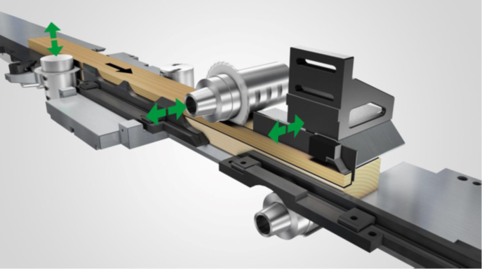 - Višji izkoristek lesa zaradi natančnega pozicioniranja s širinskim prislonom (manj napak, manj izmeta).
