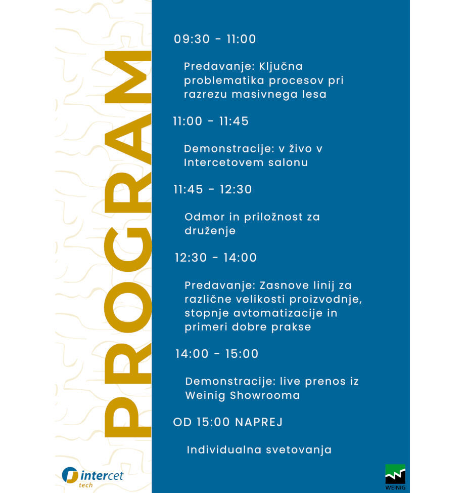 Program je zasnovan tako, da združuje strokovna predavanja, primere iz prakse in praktične demonstracije, s poudarkom na aktualnih izzivih pri razrezu masivnega lesa. Poleg predavanj v živo bo vključen tudi prenos iz Weinigovega showrooma v Nemčiji, kar omogoča neposreden vpogled v najnovejše tehnologije in prakse.